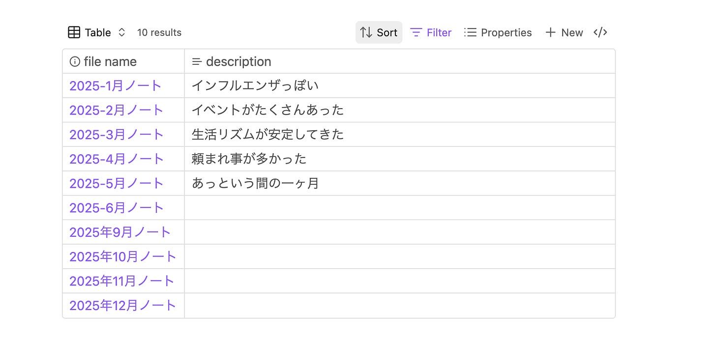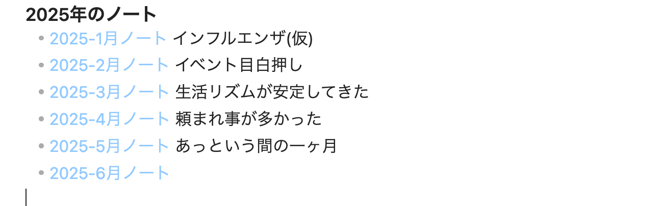 たとえば「2026年に作ったすべてのノートの総合案内所」というのが答え方の一つです。その場合、その年に作ったノートが何かしらの形でその年ごとノートにリンクさせることが必要でしょう。