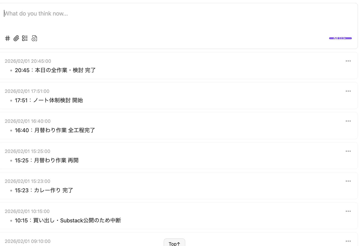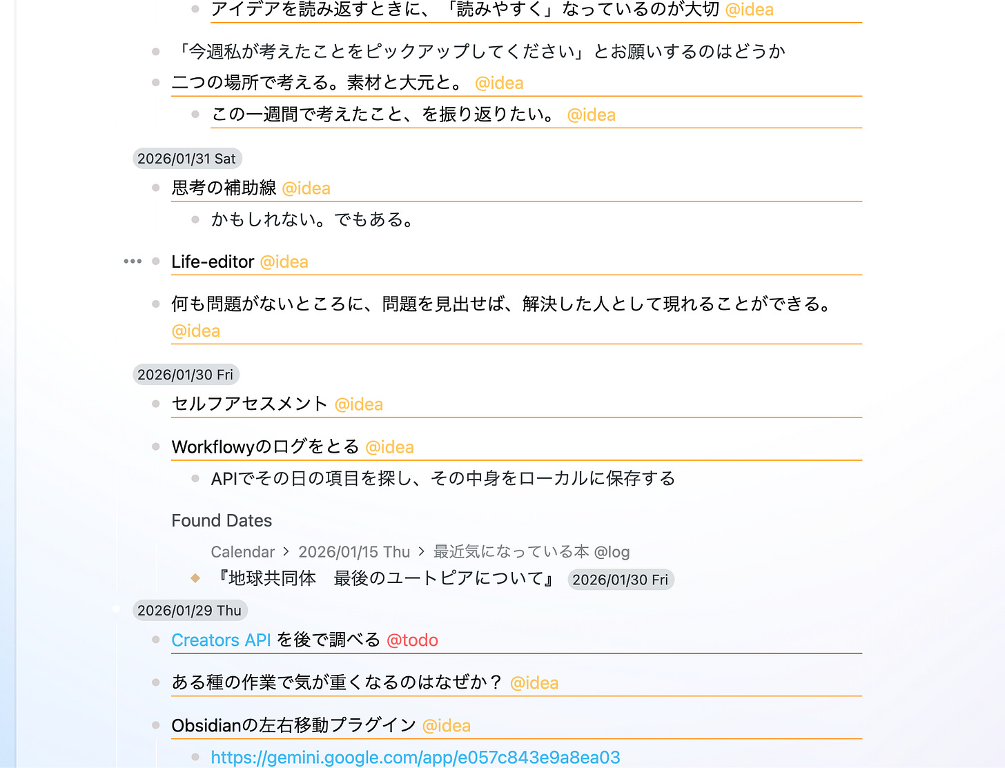 メモ自体はデイリー形式でファイルごとに分かれて保存されていますが、そうして書かれたメモ(リスト形式の部分が抽出されている)が日付の区切りなく一列に並んでいます。SNSのタイムラインにも似ていますね。