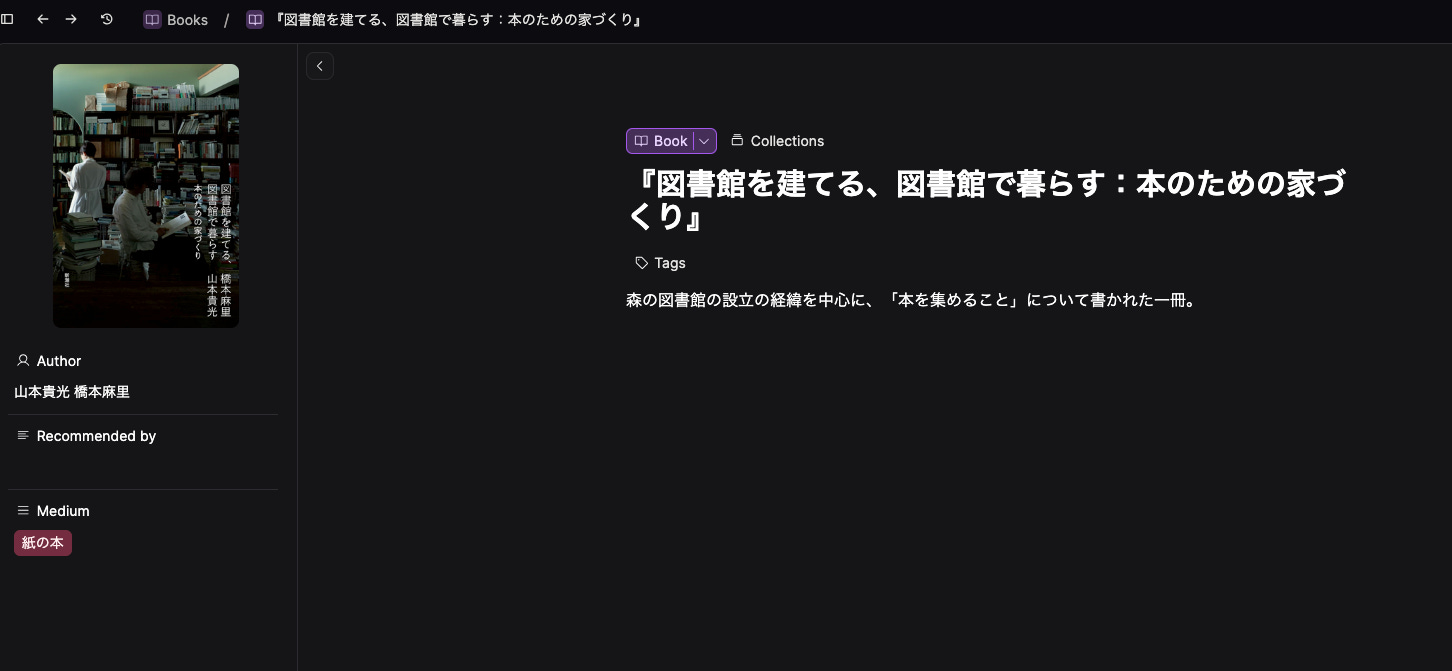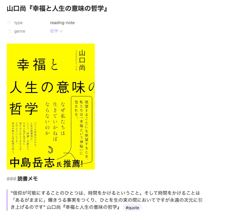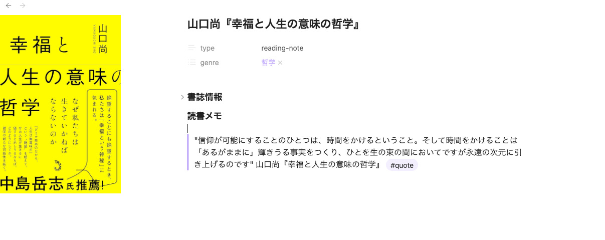 私は、Obsidianの読書ノートはAmazonページからのWebクリップを使っていないので、書誌情報は手入力です。ファイル名を調べてcoverに設定するのは面倒なこと限りありません。ノートの内部に画像を置くなら、コピペで一発です。