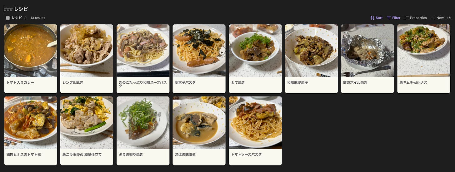 たとえば保存してあるレシピから今日作る献立を決める、という使い方をするならば、食材ごとに検索できた方が便利でしょう。タグやプロパティを使って”分類”するのが良さそうです。実際私も、自分のレシピノートを作ったときにそうした分類を思いついて「食材」というプロパティを当てていたのですが、途中でばかばかしくなって一切止めました。ほとんどまったく使わないのです。