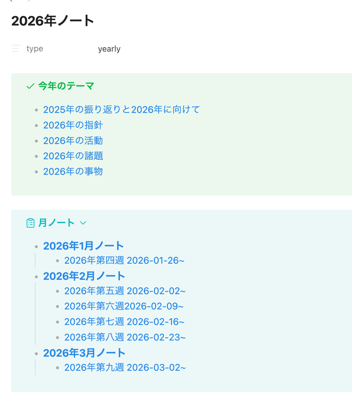 ただし、アナログの手帳と違うのがこれらを「繰って」いくことができない、という点です。リンクを押し、そのページを開き、また戻って、次のページのリンクを開くという操作はできても、手帳のように次→次→次→次ができません。標準の状態でその操作が可能なのはデイリーノートだけです。
