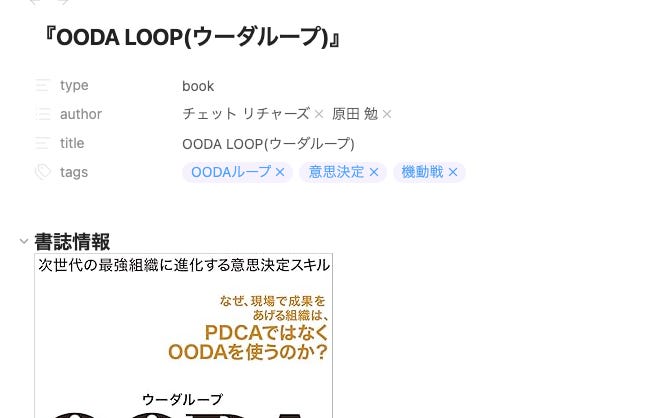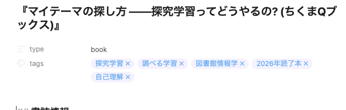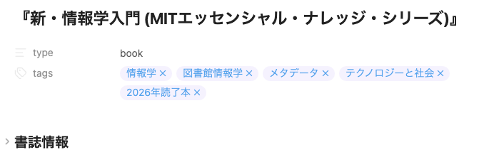 今回話題に上げたいのはこちらではなく、「ノート全体に付与する」の方です。そのノート全体がどんな文脈を持っているのかを示すもの。私はフロントマターにつけることが多いです(絶対ではありませんが)。