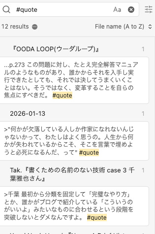 Obsidianでは、検索結果で該当する行が抜粋されるので、さまざまなノートに散らばっている要素を串刺しするときに便利に使えます。