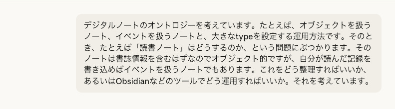 Claudeは”面白い問題ですね。「読書ノート」のような両義的なエンティティは、オントロジー設計の古典的な難問です”と返し、そこからかなり長いやりとりが行われました。
