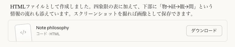 途中、二人の議論でまとまりつつあったコンセプトが表組みで提示されたのですが、そのままでは扱いづらいので「画像で作れます?」と尋ねると、”画像ファイルを直接生成する機能は持っていません”と述べた後で、Claudeはこう続けました。