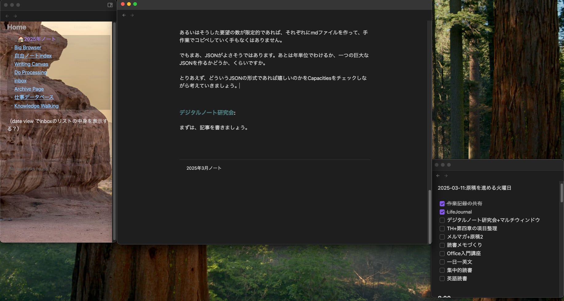 右下にちょこんと開かれているのは、実は真ん中で開いているのと同じノートです。これを書いている今日は3月11日なので、真ん中で20250311.mdというファイルを開き、それと同じファイルを右下のちょこんとファイルでも開いているという格好です。