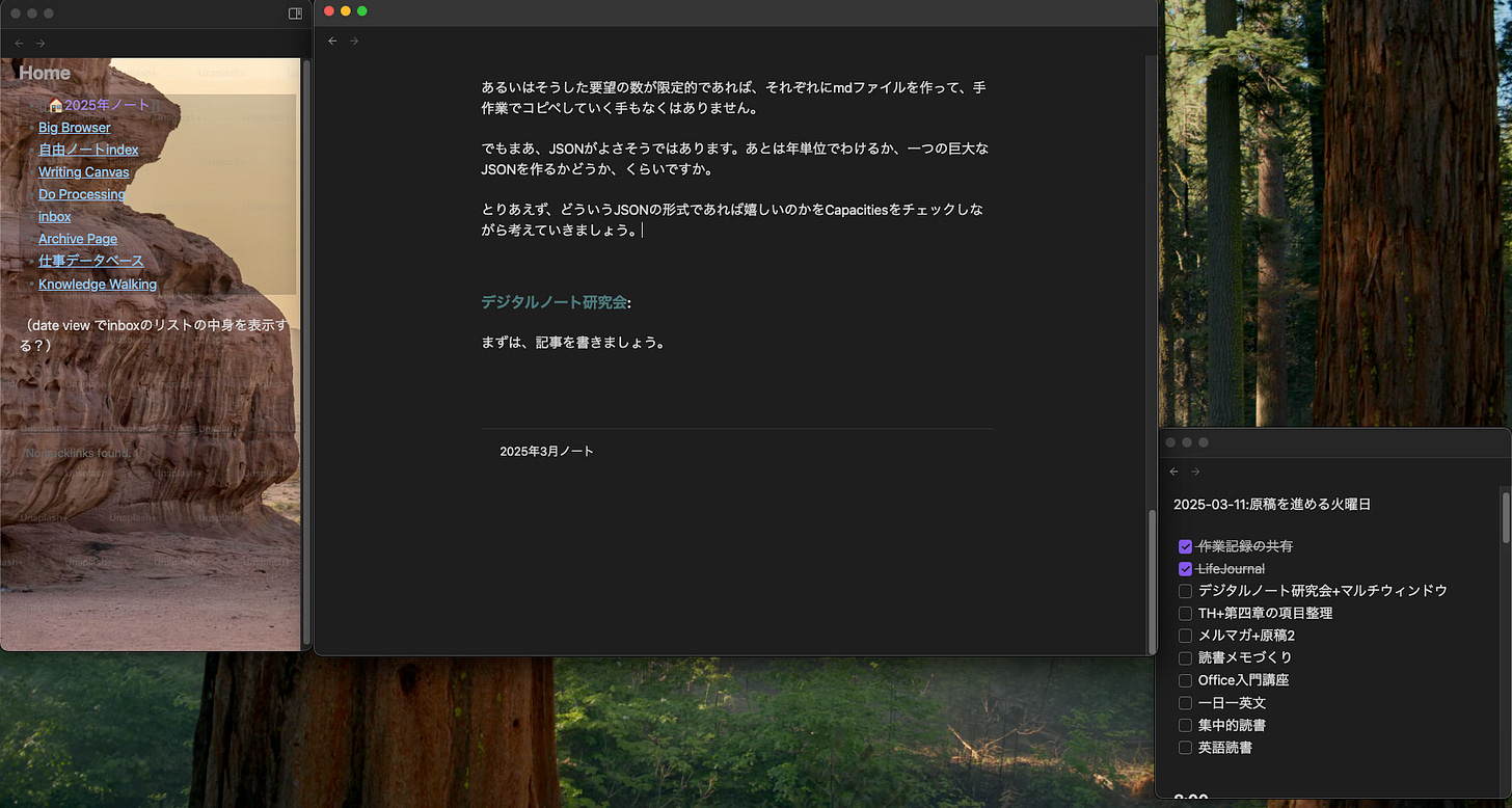 これは作業記録+タスクリストだけでなく、原稿+アウトラインという形でも使えるト思います。新しいウィンドウだからといって、別のノートを開かなければならないということはない。発想の転換です。