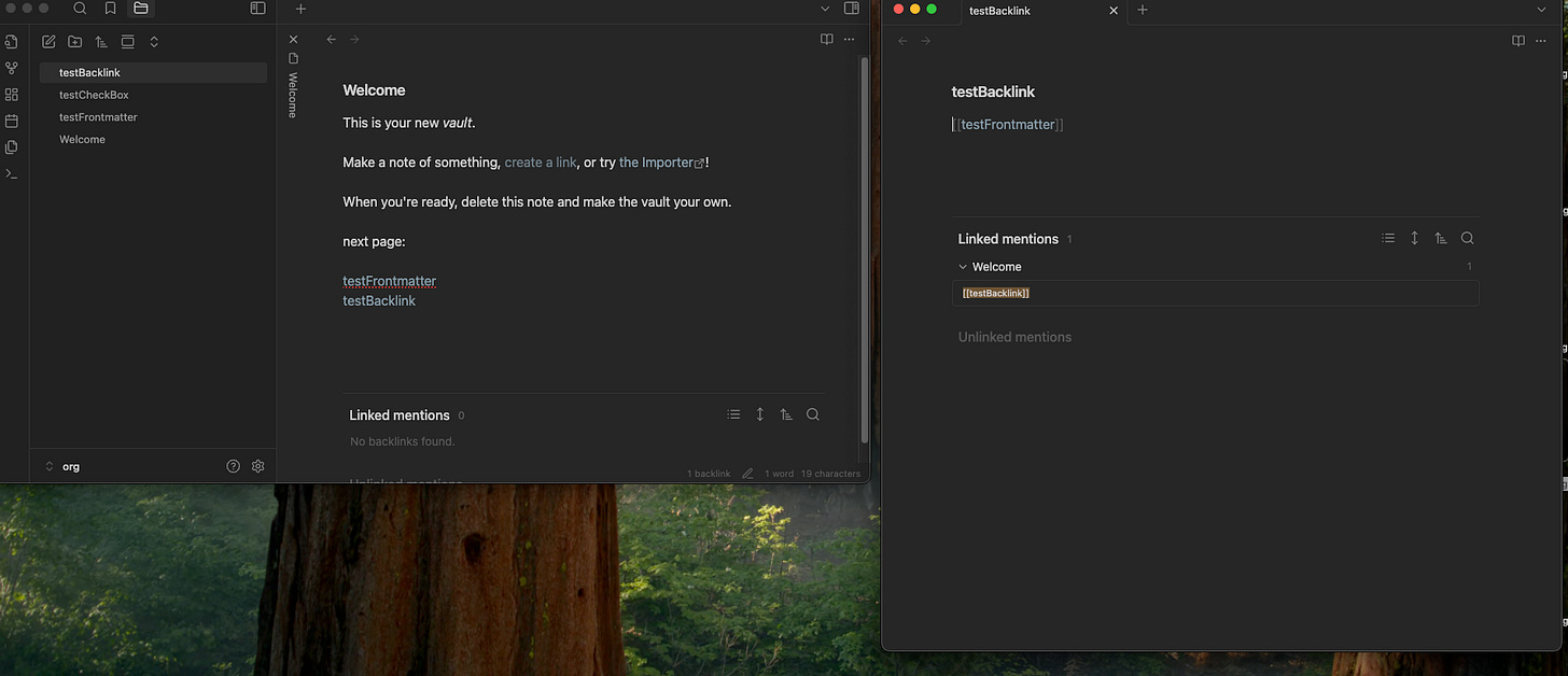 特に最近のノートツールはシングルウィンドウ型が多いので、複数のウィンドウを自由に展開できるObsidianには特別な好感を持っています。