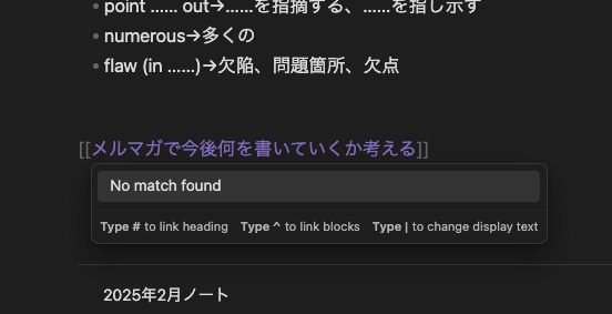 このやり方をすると、必ずバックリンクにおおもとのページが表示されることになります(バックリンクとは表示されているページのリンクを持つページのことで、この場合は、「2025-02-25」がそのページとなります)。「最低一つはリンクを心がける」が見事に達成されているというわけです。