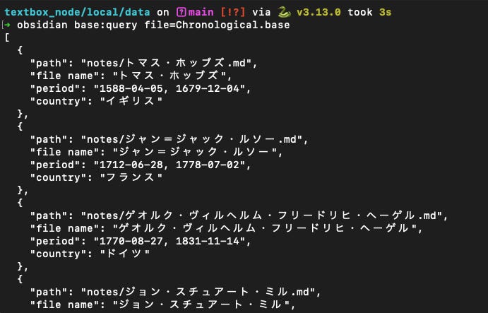 なのでこれまでbaseの情報はObsidian上でしか触れませんでした。それがこのCLIで変わります。