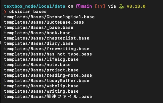 たとえば、obsidian basesを叩けば(*コマンドを実行する、の意)、以下のように存在するbaseファイルの一覧が返ってきます。