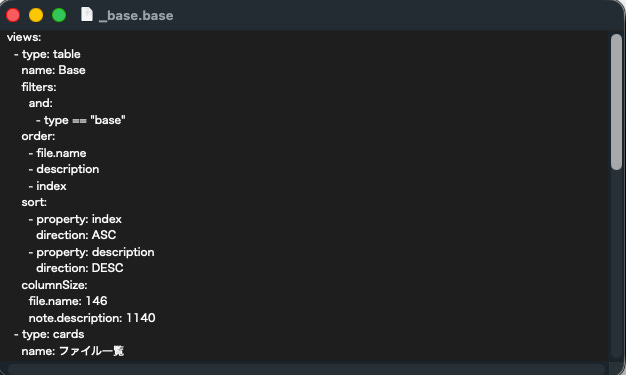 Obsidianの通常の情報は、さっきのようにmdファイルにアクセスすればいいだけです。しかし、baseはそうはいきません。baseファイルの中身って、こんな感じです。