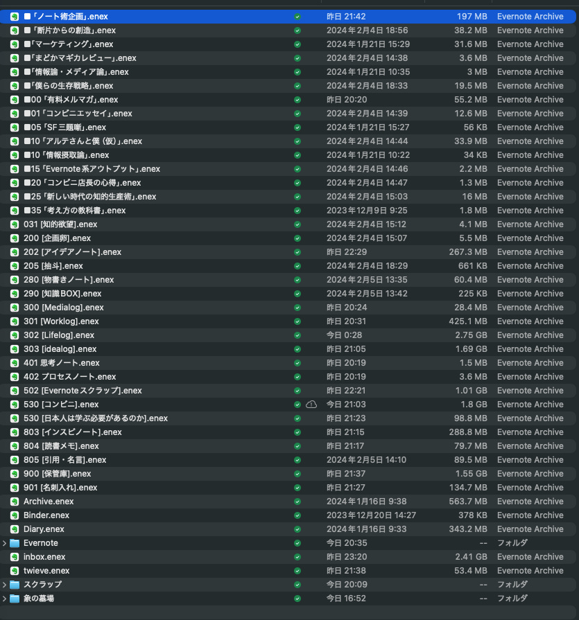 現状Evernoteのノート全てを一気にエクスポートするのは難しいので、ノートブック一つずつに対してエクスポート操作を行いました。ファイル一つが、ノートブック一つです。サイズはいろいろですが、中には2GB以上のものがありますね。
