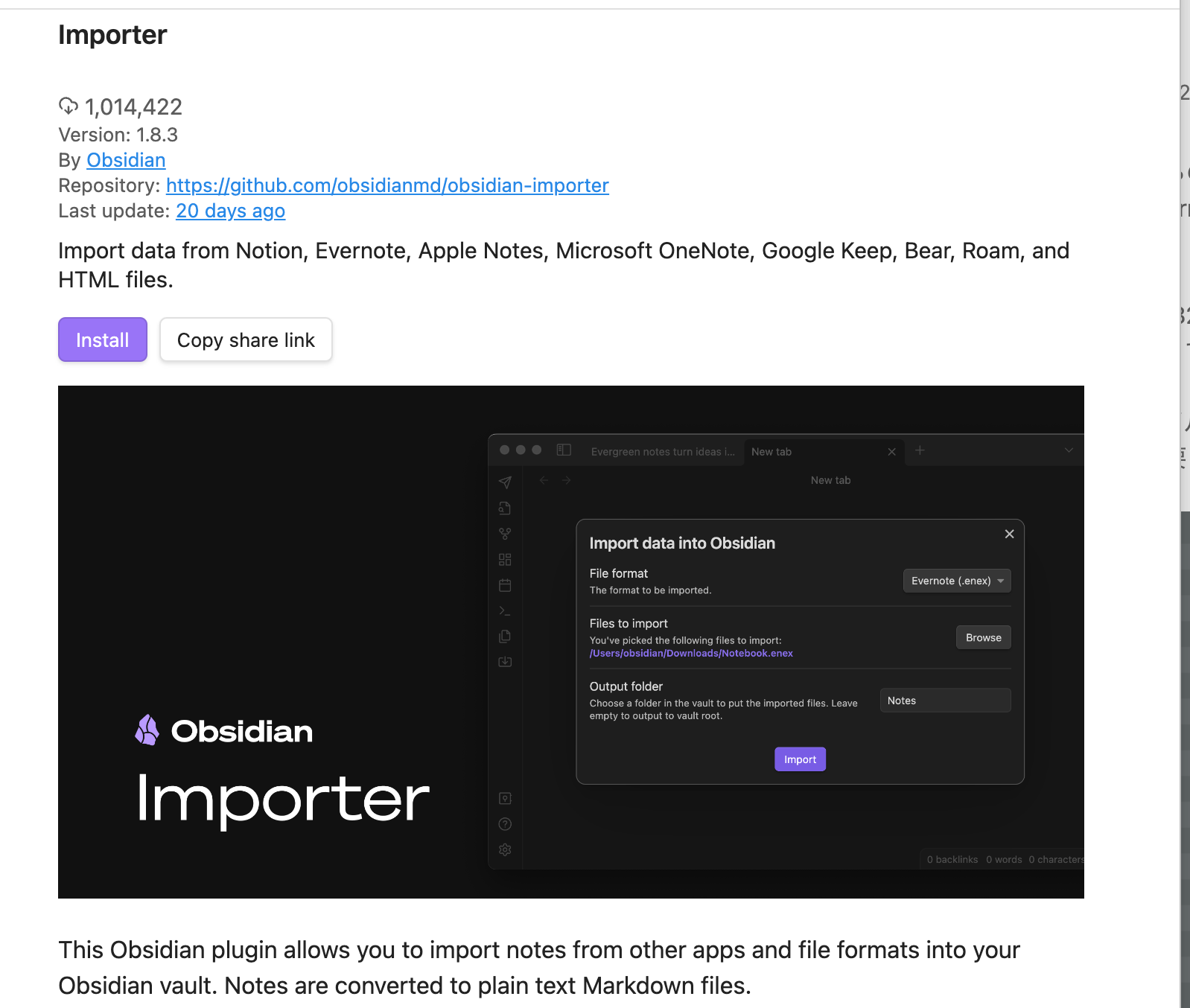 生成AIに変換用のスクリプトを書いてもらうこともできますが、ひとまず相談してみると、「importer」というコミュニティープラグインがあるよと教えてもらいました。