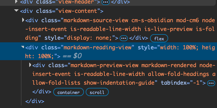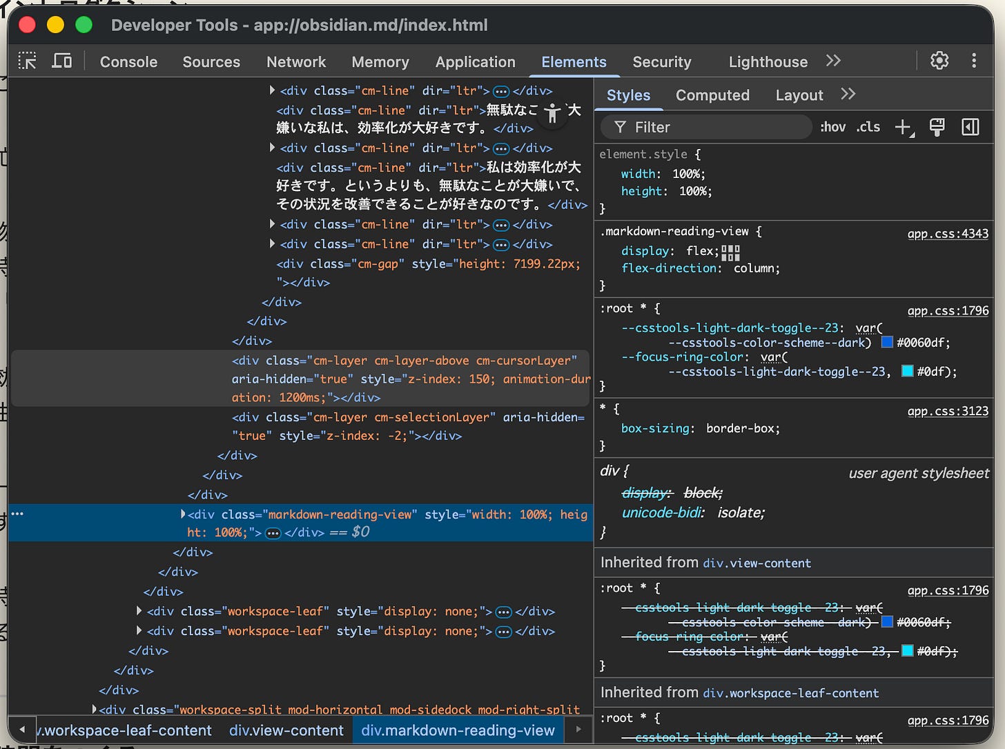で、気がついたですが、Obsidianでは、source-viewとreading-viewは常に生成されていて、片方が選ばれているときはもう片方がdisplay:none;になっているようです。勉強になりました。