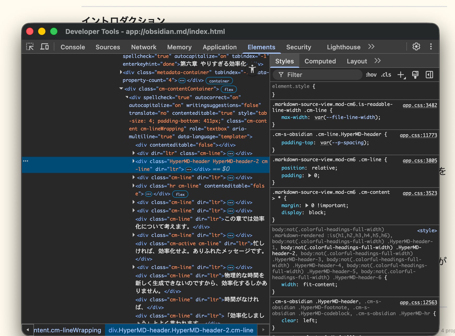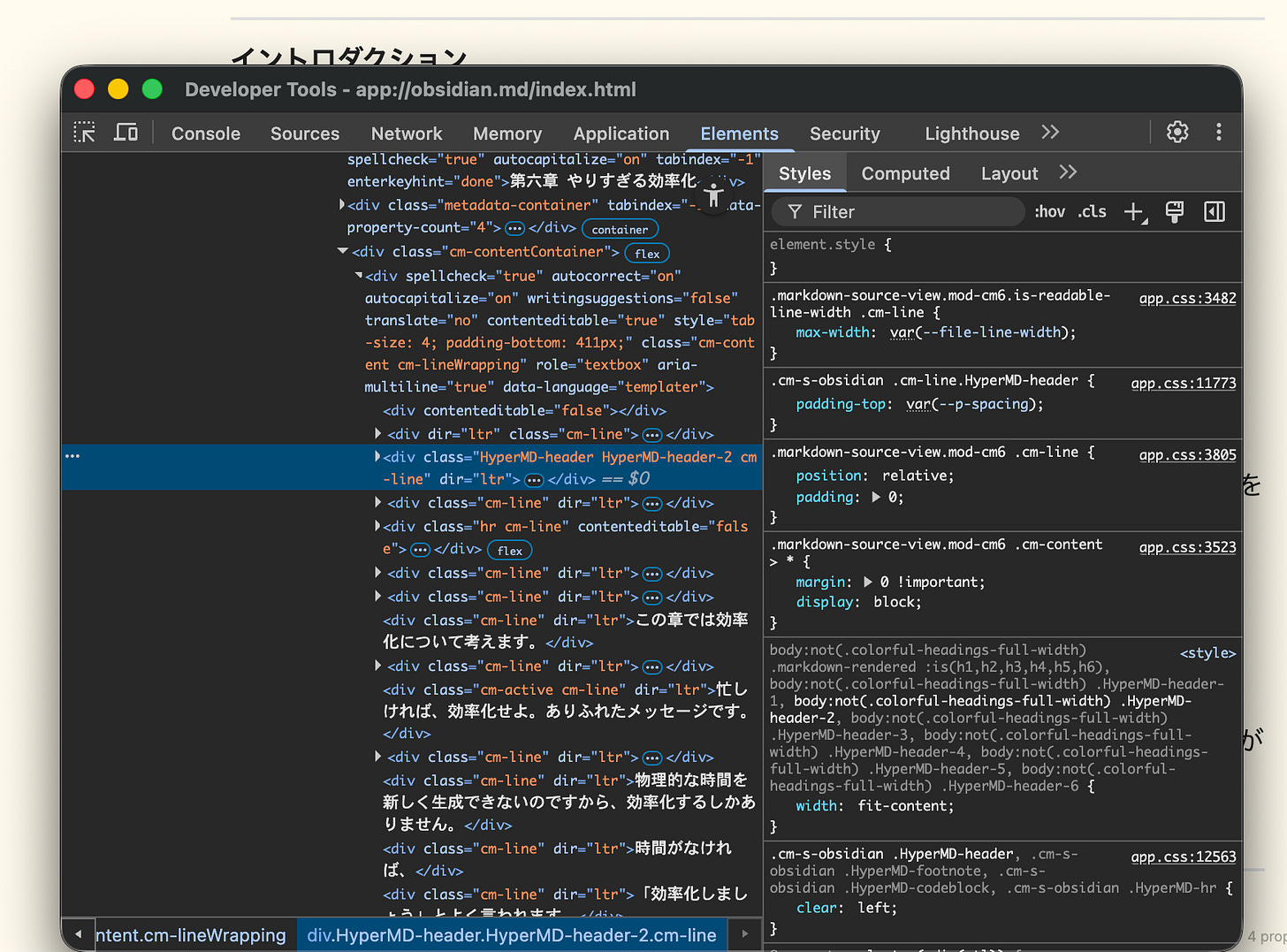 ObsidianでCSSをいじる場合は、まずHTMLの調査からです。