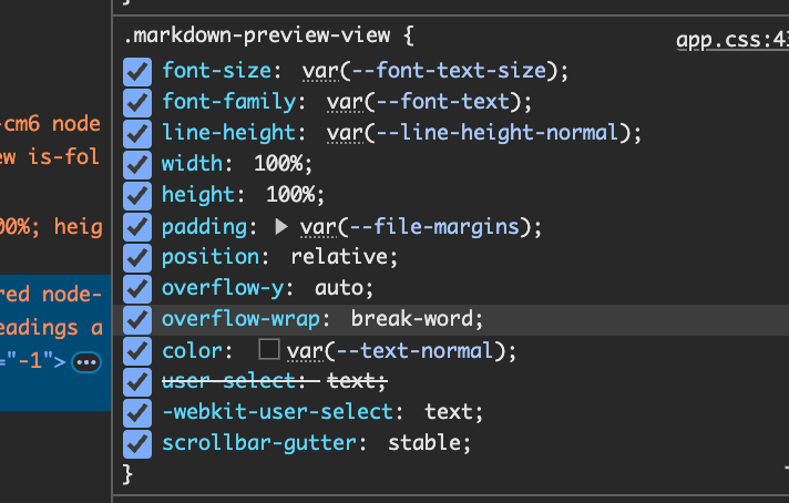 とりあえず、対象のDivがわかったので、あとはスタイルを書き換えるだけです。stylec.cssをいじります。もともとの設定でfont-familyを持っているのは、markdown-preview-view です。