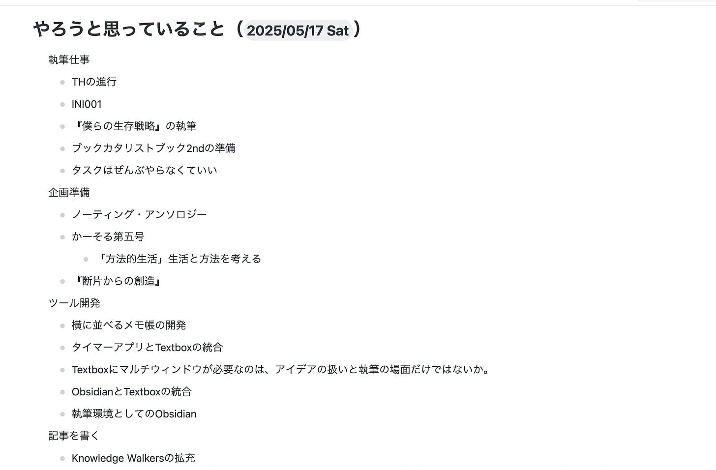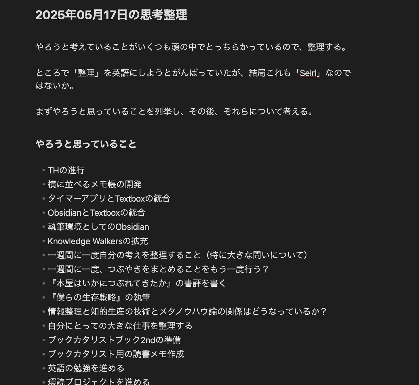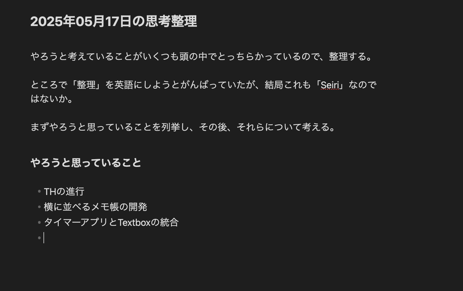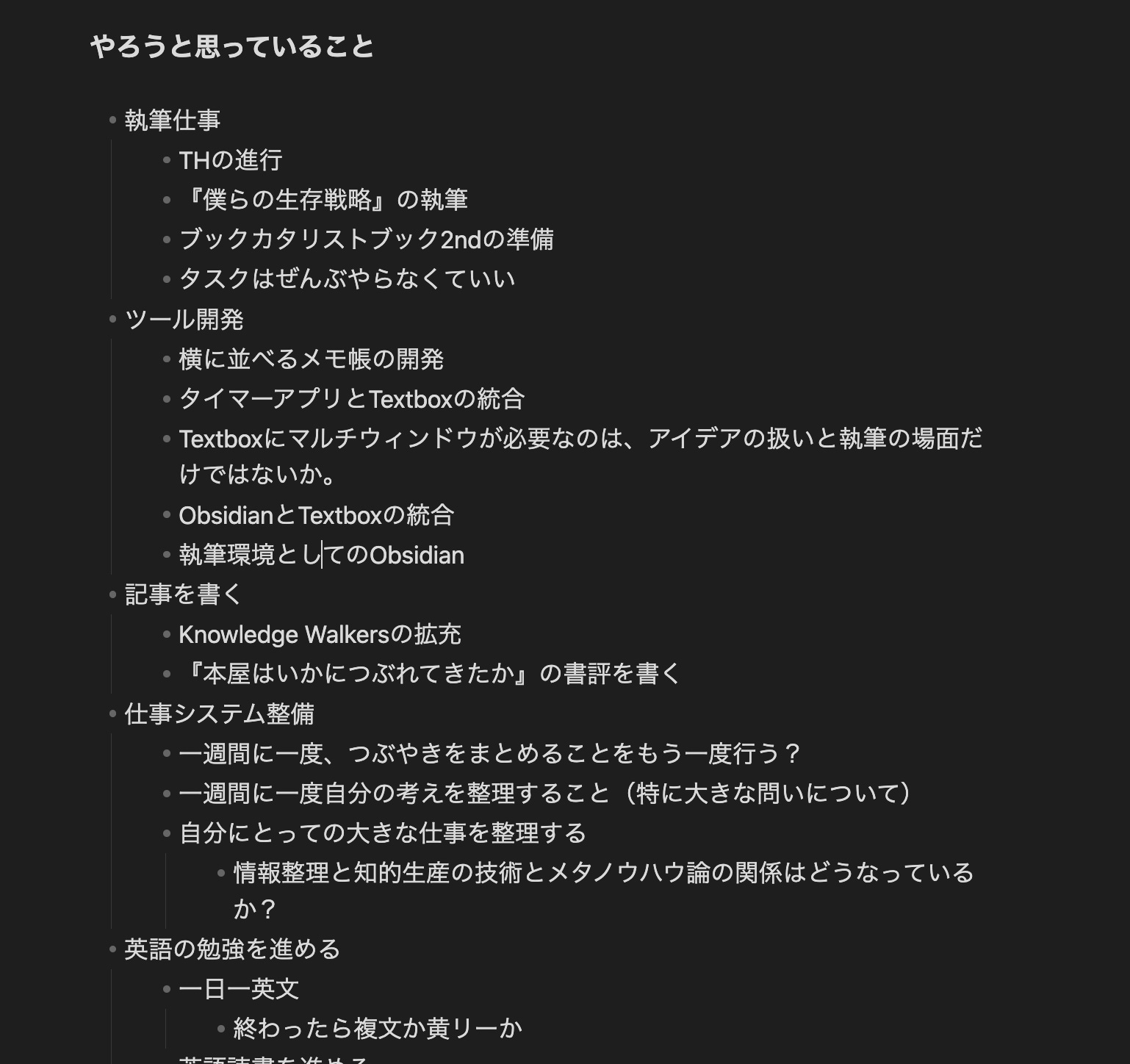 途中から箇条書きが始まったので、そのまま書き並べました。この際「階層構造」について考えるのはタブーです。思いついたことをそのまま並べる。階層が作れそうでも、いったんはグッと押さえて書き進めることをオススメします(気が逸れるからです)。